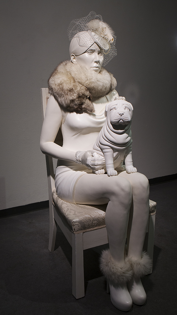 Madonna ja pentu Madonna ja pentu. 2016. Maalattu kipsi, spray, tekstiili, somisteet, ketun kallo. Kork. 128 cm. Aiheeseen liittyy